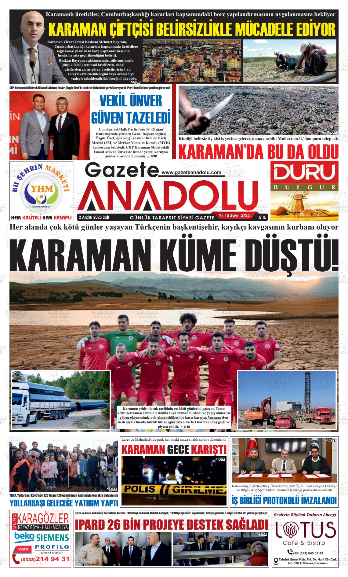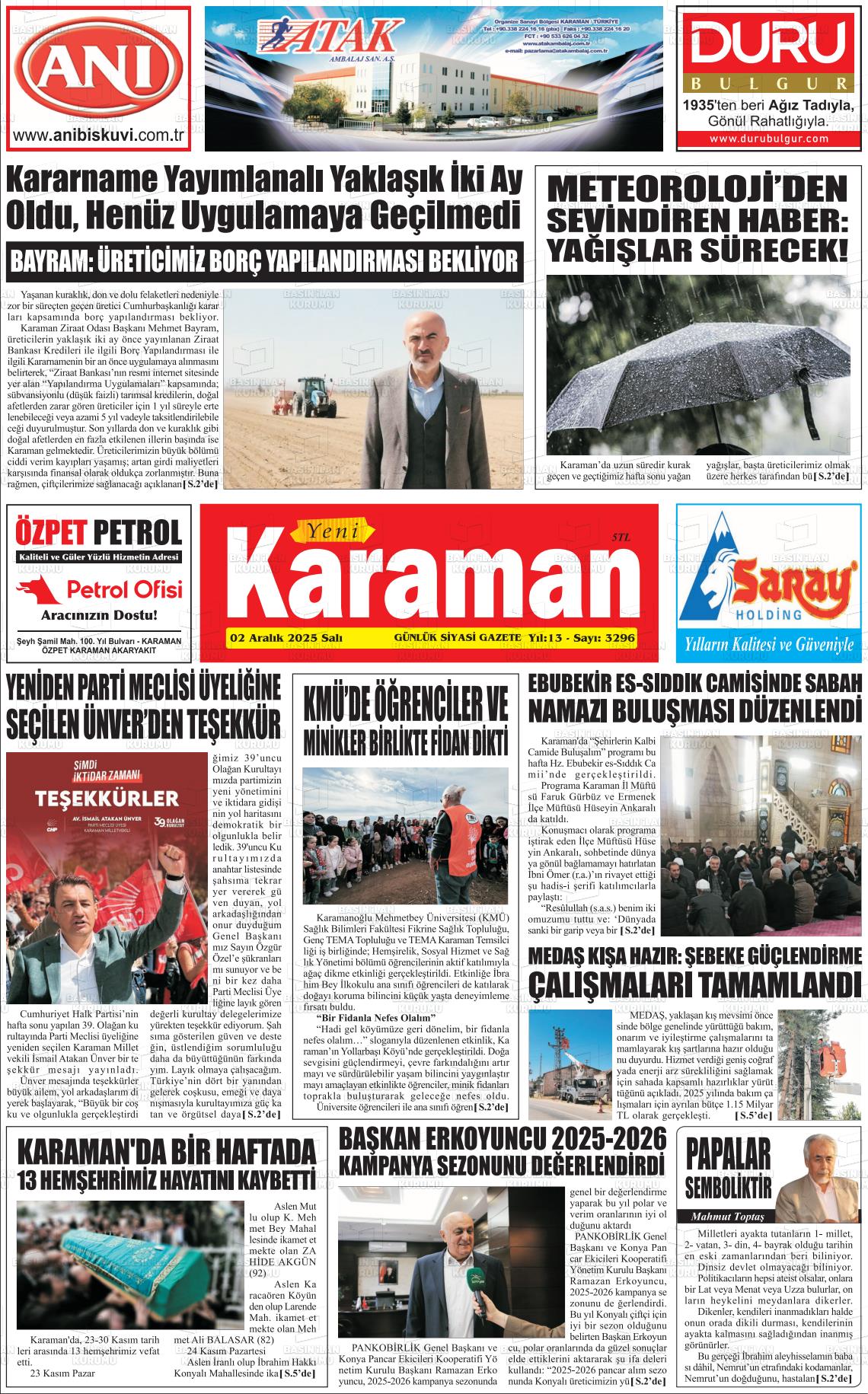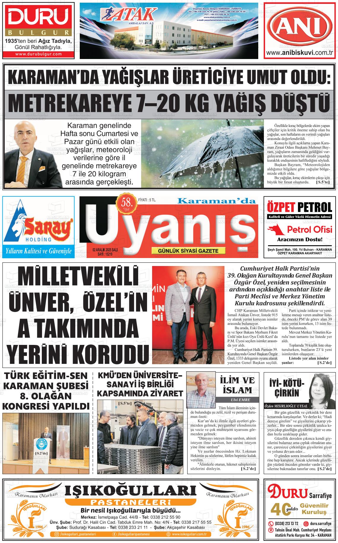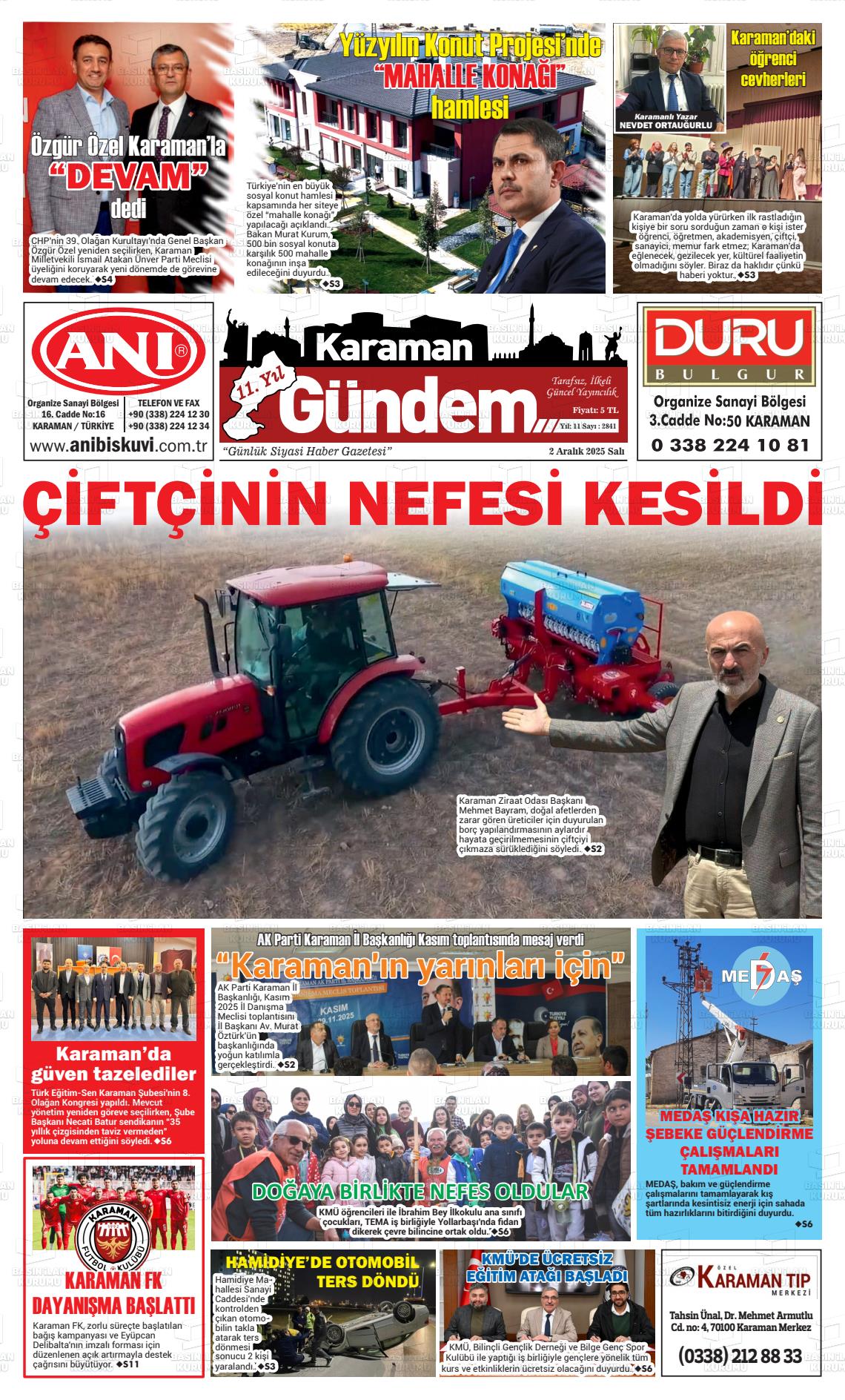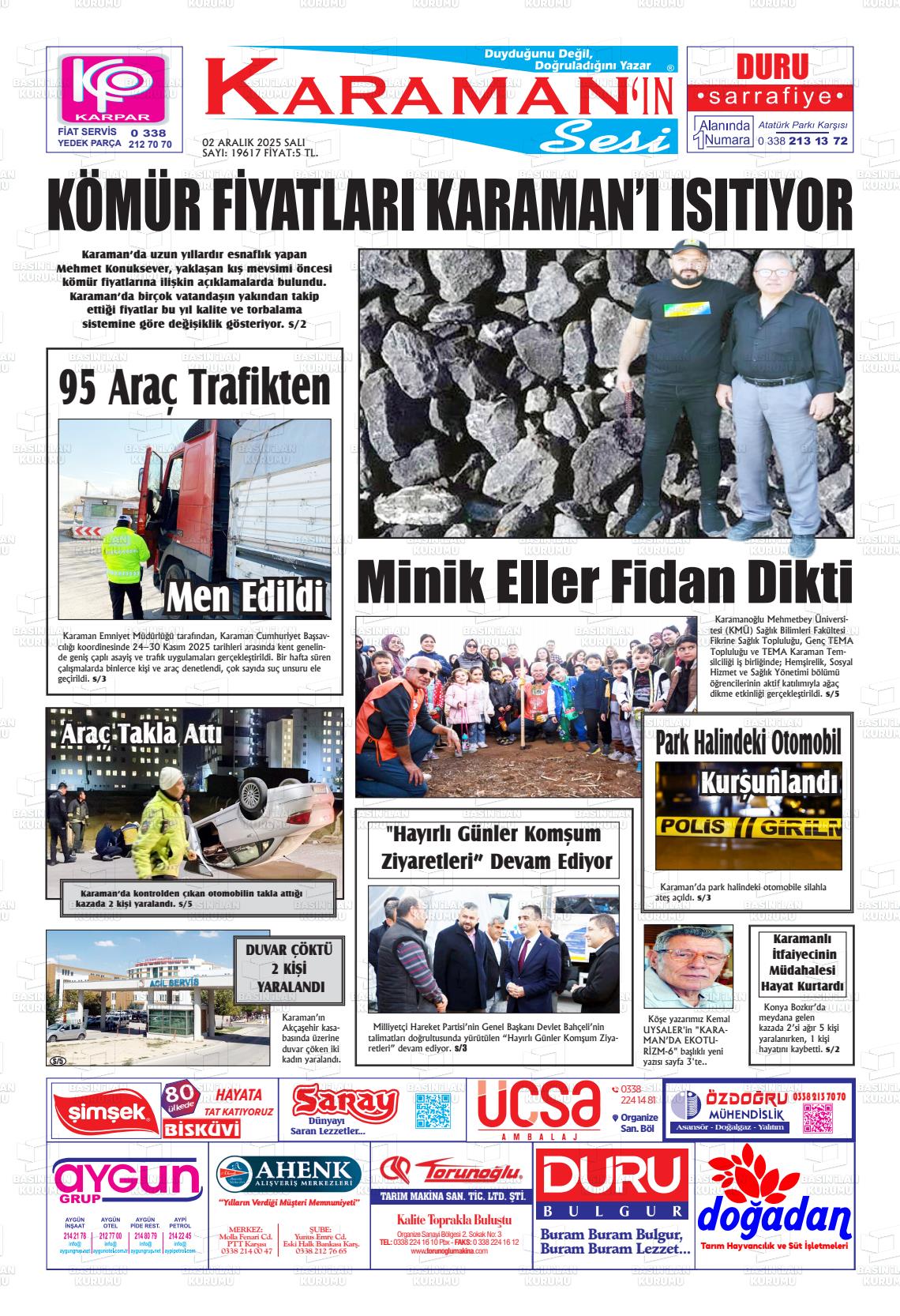 Karaman Yerel Gazeteleri 02 Aralık 2025, Salı Günü Manşeti