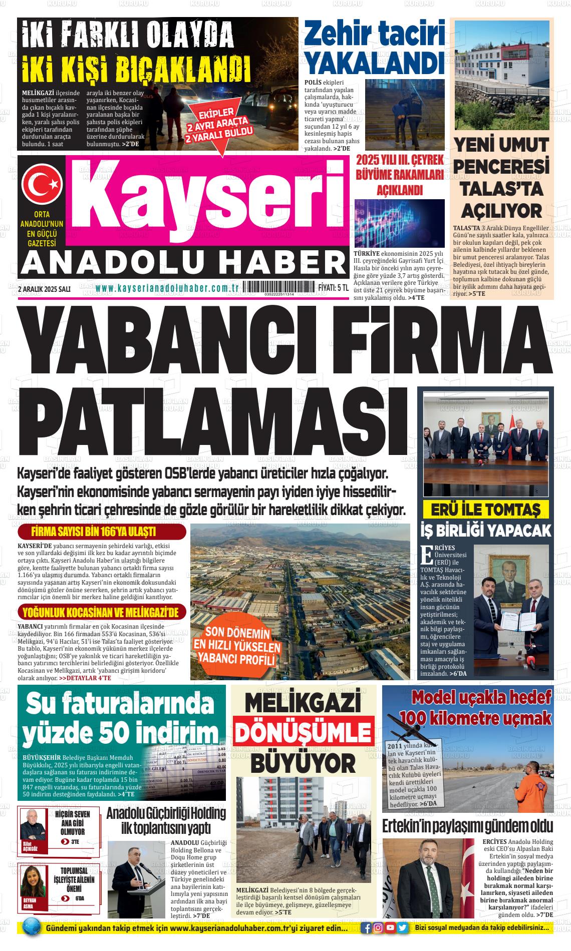 Kayserİ Yerel Gazeteleri 02 Aralık 2025, Salı Günü Manşeti
