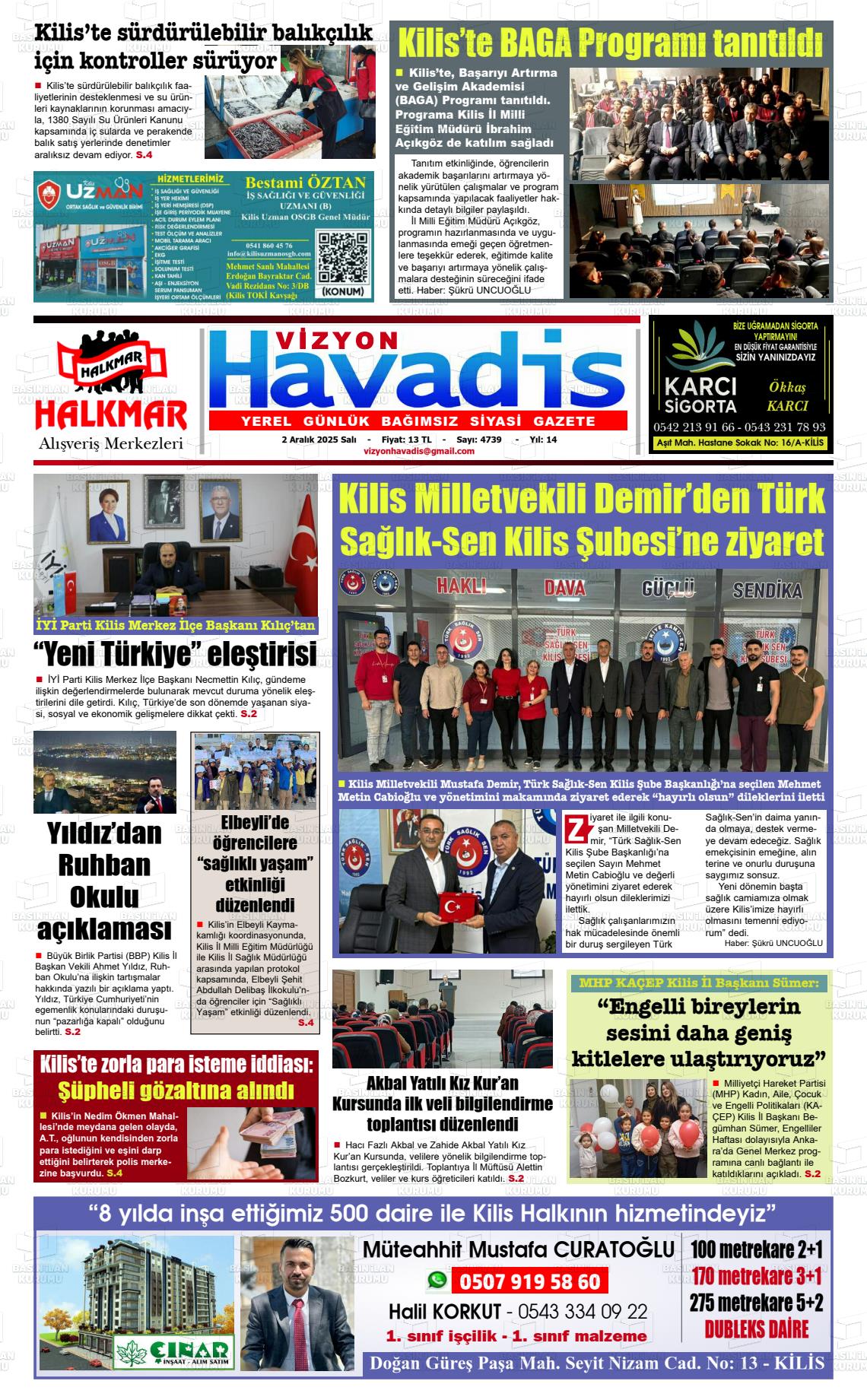 Kİlİs Yerel Gazeteleri 02 Aralık 2025, Salı Günü Manşeti
