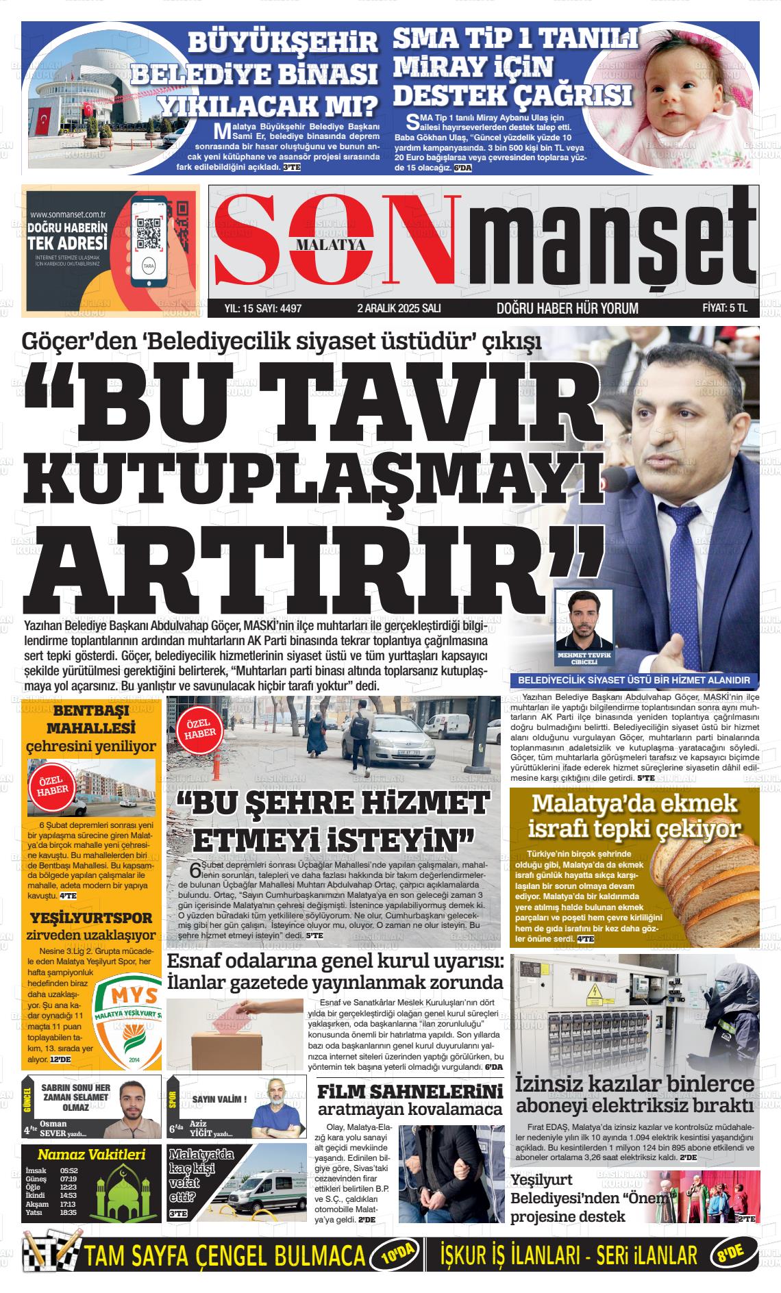 Malatya Yerel Gazeteleri 02 Aralık 2025, Salı Günü Manşeti