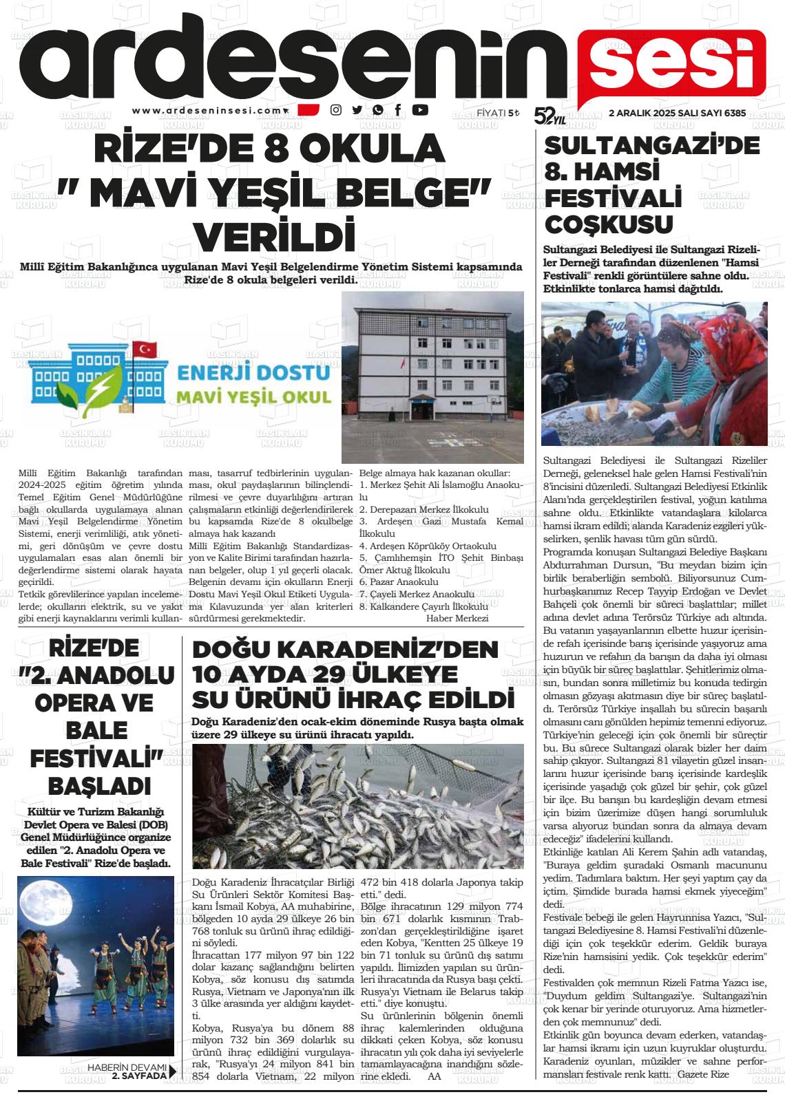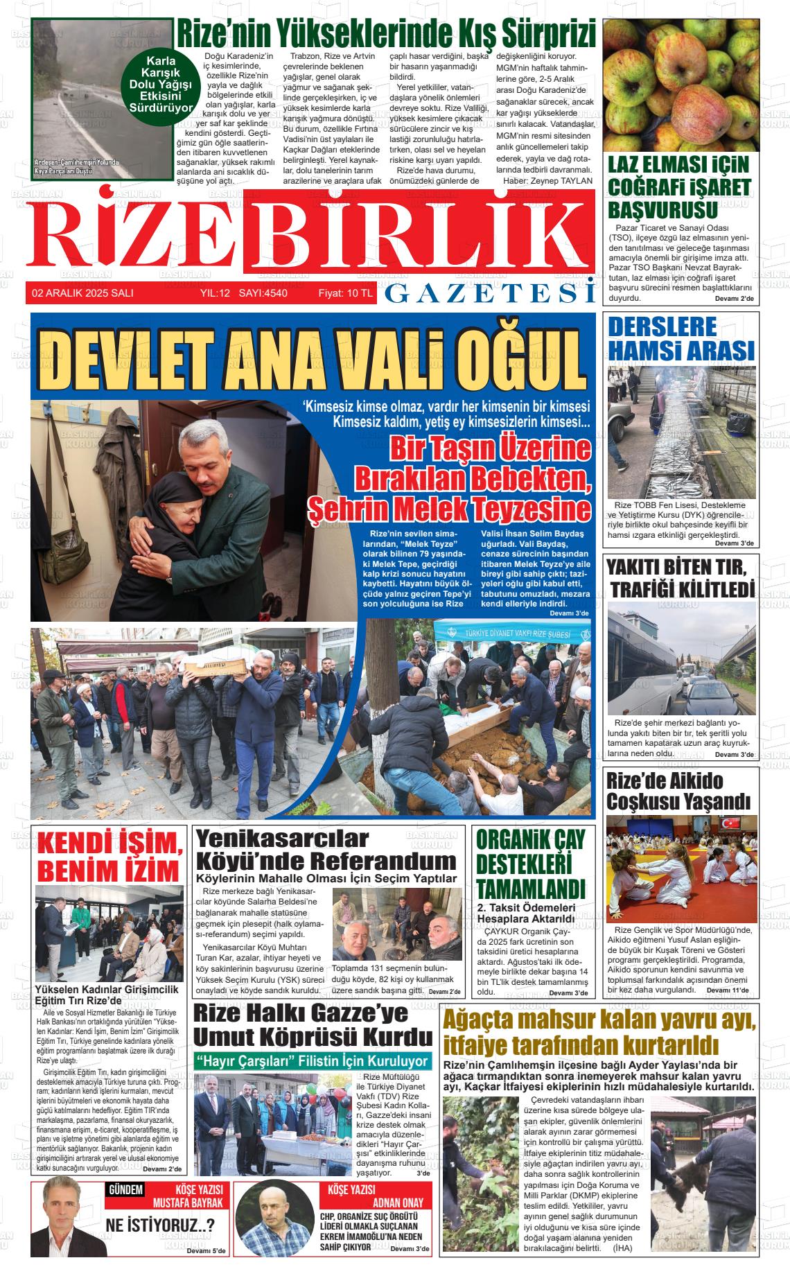 Rİze Yerel Gazeteleri 02 Aralık 2025, Salı Günü Manşeti