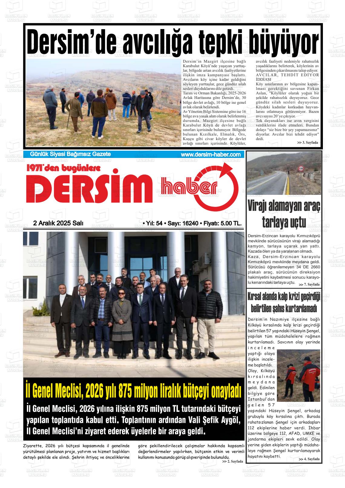Tuncelİ Yerel Gazeteleri 02 Aralık 2025, Salı Günü Manşeti