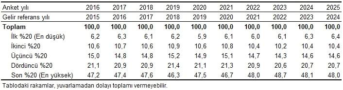 Son yapılan araştırma sonuçlarına nazaran; en yüksek muadil hanehalkı kullanılabilir fert gelirine sahip %20’lik kümenin toplam gelirden aldığı hisse bir evvelki yıla nazaran 0,1 puan azalarak %48,0 olurken en düşük gelire sahip %20’lik kümenin aldığı hisse ise 0,1 puan artarak %6,4 oldu.