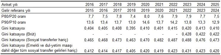 Daha evvelki yıllardan farklı olarak 2025 yılı sonuçları ile birlikte, idari kayıtlardan elde edilen vergi ve toplumsal güvenlik priminin net kullanılabilir gelire dahil edilmesi ile elde edilen brüt gelir için Gini katsayısı hesaplandı.