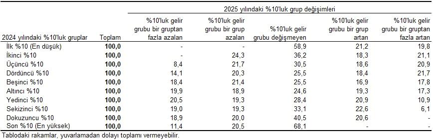 Eşdeğer hanehalkı kullanılabilir fert gelirine nazaran sıralı %10’luk gelir kümeleri prestijiyle fertlerin bir evvelki yıla nazaran yüzdelik geçişleri incelendiğinde; bir evvelki yılda birinci %10’luk kümede olan fertlerin 2025 yılında %58,9’unun, son %10’luk kümede olan fertlerin ise %68,1’inin gelir kümesi değişmedi. Ayrıyeten 2024 yılında birinci %10’luk kümede olan fertlerin %19,8’i 2025 yılında bir gelir kümesinden fazla yükseldi. Son %10’luk kümede olan fertlerin %11,4’ü ise bir gelir kümesinden fazla düştü.
