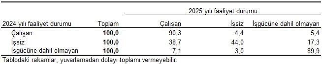 Gelir ve Hayat Şartları Araştırması panel datadan elde edilen sonuçlara nazaran 2024 yılında işsiz olan fertlerin %38,7’si 2025 yılında çalışmaya başladı. Faaliyet durumu 2024 yılında çalışan olarak belirlenen fertlerin %90,3’ü 2025 yılında çalışma hayatına devam etti. Bir evvelki yıl işgücüne dahil olmayan fertlerin ise %10,1’i işgücüne (çalışan+işsiz) katıldı.