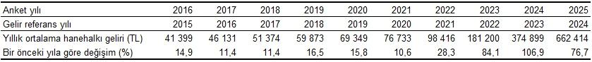 Yıllık ortalama hanehalkı kullanılabilir geliri ve bir evvelki yıla nazaran değişim, 2016-2025