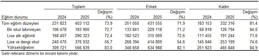 Eğitim durumuna nazaran yıllık ortalama temel iş gelirleri sırasıyla yükseköğretim mezunlarında 566 bin 839 TL, lise ve dengi okul mezunlarında 376 bin 932 TL, lise altı eğitimlilerde 290 bin 323 TL, bir okul bitirmeyenlerde 183 bin 900 TL olarak hesaplandı. Geçen yıla nazaran yıllık ortalama temel iş gelirinde en yüksek artış %83,0 ile yükseköğretim, en düşük artış ise %56,7 ile lise ve dengi okul mezunlarında oldu.