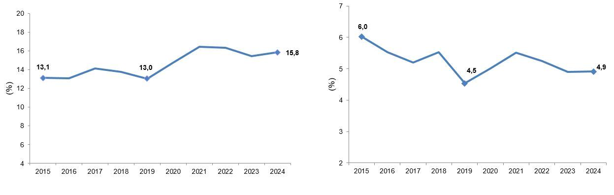 Girişimlerin doğum oranı (%), 2015-2024 Doğan teşebbüslerin istihdam yaratma hissesi (%), 2015-2024