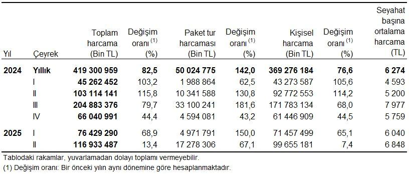 Yerli turistlerin, yurt içinde yaptıkları seyahat harcamaları 2025 yılının II. çeyreğinde bir evvelki yılın birebir çeyreğine nazaran %13,4 artarak 116 milyar 933 milyon 487 bin TL olarak gerçekleşti. Bu harcamaların %85,2’sini 99 milyar 655 milyon 181 bin TL ile ferdî harcamalar, %14,8’ini ise 17 milyar 278 milyon 306 bin TL ile paket çeşit harcamaları oluşturdu. Seyahat başına yapılan ortalama harcama ise 6 bin 848 TL oldu.