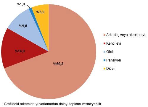 Bu çeyrekte seyahate çıkanlar 68 milyon 739 bin geceleme sayısı ile en çok “arkadaş yahut akraba evinde” kaldı. Konaklama cinslerine nazaran geceleme sayısında ikinci sırada 13 milyon 886 bin geceleme ile “kendi evi” yer alırken, “otel” 9 milyon 727 bin geceleme sayısı ile üçüncü sırada yer aldı.