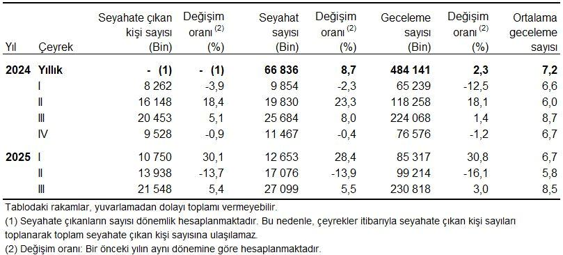 Seyahate çıkan kişi, seyahat ve geceleme sayıları, III. Çeyrek: Temmuz-Eylül, 2025
