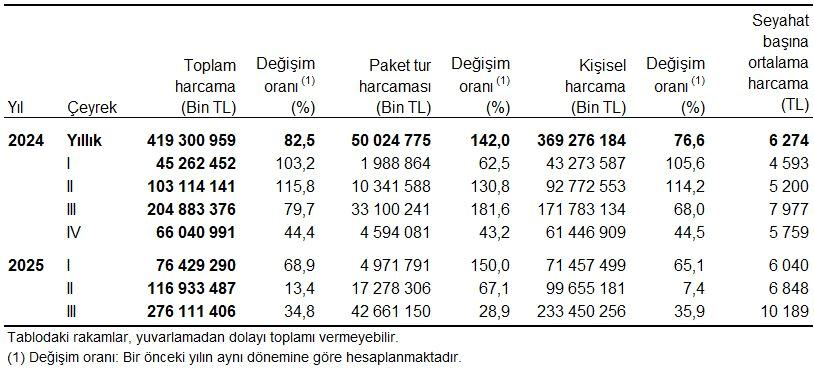 Yerli turistlerin, yurt içinde yaptıkları seyahat harcamaları 2025 yılının III. çeyreğinde bir evvelki yılın birebir çeyreğine nazaran %34,8 artarak 276 milyar 111 milyon 406 bin TL olarak gerçekleşti. Bu harcamaların %84,5’ini 233 milyar 450 milyon 256 bin TL ile şahsî harcamalar, %15,5’ini ise 42 milyar 661 milyon 150 bin TL ile paket çeşit harcamaları oluşturdu. Seyahat başına yapılan ortalama harcama ise 10 bin 189 TL oldu.