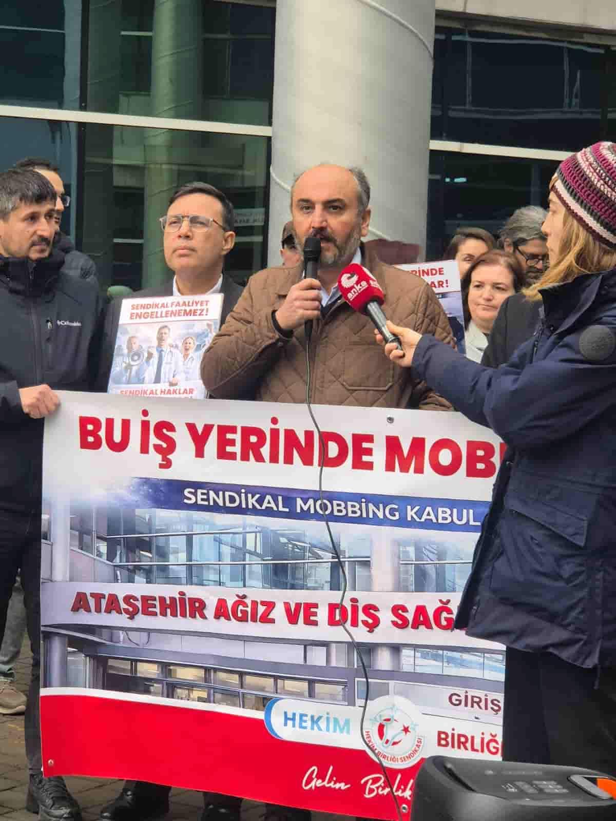 İstanbul Ataşehir Ağız ve Diş Sağlığı Hastanesi önünde düzenlenen basın açıklamasına sağlık iş kolundaki sendikalar, Hekim Birliği Genel Başkan Yardımcısı Op. Dr. Çağlar Yıldırım ve Hekim Birliği İstanbul Şube Yönetimi’nin katılımıyla gerçekleşti. Hekim Birliği yöneticileri tarafından yapılan açıklamada şu ifadelere yer verildi, “Bugün burada; emeğiyle, liyakatiyle ve onuruyla görev yapan hekimlerin, sistematik bir baskı ve yıldırma politikasıyla karşı karşıya kalmasına “DUR” demek için toplandık. Hekim Birliği İstanbul Şube Yönetim Kurulu üyemiz Dt. Janat Düzgün, son dönemde ardı arkası kesilmeyen, hiçbir hukuki dayanağı olmayan mesnetsiz soruşturmaların ve nihayetinde “cezalandırma” amacı taşıyan usulsüz bir tayin kararının hedefi olmuştur”