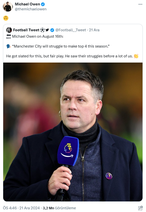 Sezon öncesinde bu düşüşü öngören Michael Owen, 16 Ağustos’ta yaptığı bir yorumla dikkatleri üzerine çekmişti. Football365’e verdiği röportajda Owen, sıralama tahminlerini şu şekilde paylaşmıştı: “Birinci Arsenal, ikinci Liverpool, üçüncü Aston Villa ve dördüncü Manchester City olacak. Bu konuda bahis oynayacağım. City’nin bu yıl tökezleyebileceğini düşünüyorum. Geçtiğimiz sezon inanılmaz bir performans sergilediler ama her zaman aynı seviyede kalamazsınız” ifadelerini kullanmıştı. Eski golcünün bu tahmini yeniden gündem oldu ve “Kahin” benzetmelerini de beraberinde getirdi.