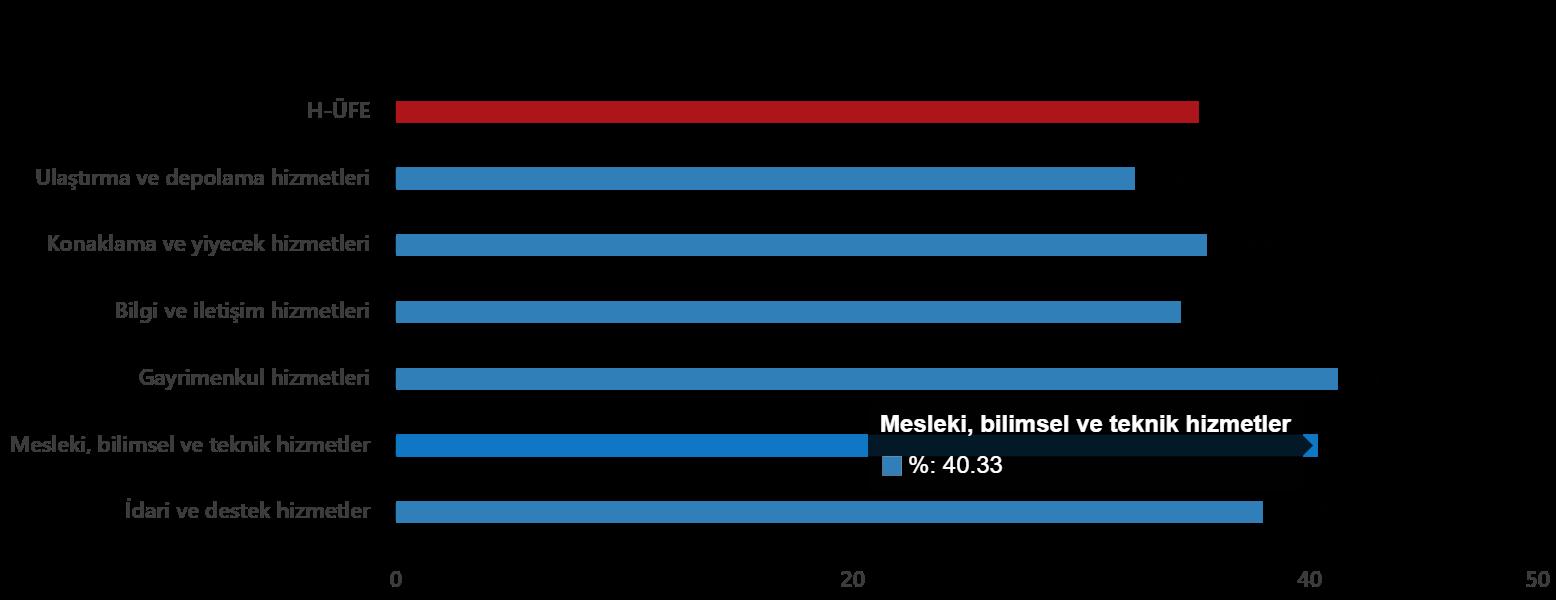 Bir evvelki yılın birebir ayına nazaran, ulaştırma ve depolama hizmetlerinde %32,32 artış, konaklama ve yiyecek hizmetlerinde %35,46 artış, bilgi ve irtibat hizmetlerinde %34,32 artış, gayrimenkul hizmetlerinde %41,21 artış, mesleksel, bilimsel ve teknik hizmetlerde %40,33 artış, idari ve takviye hizmetlerde %37,92 artış gerçekleşti.