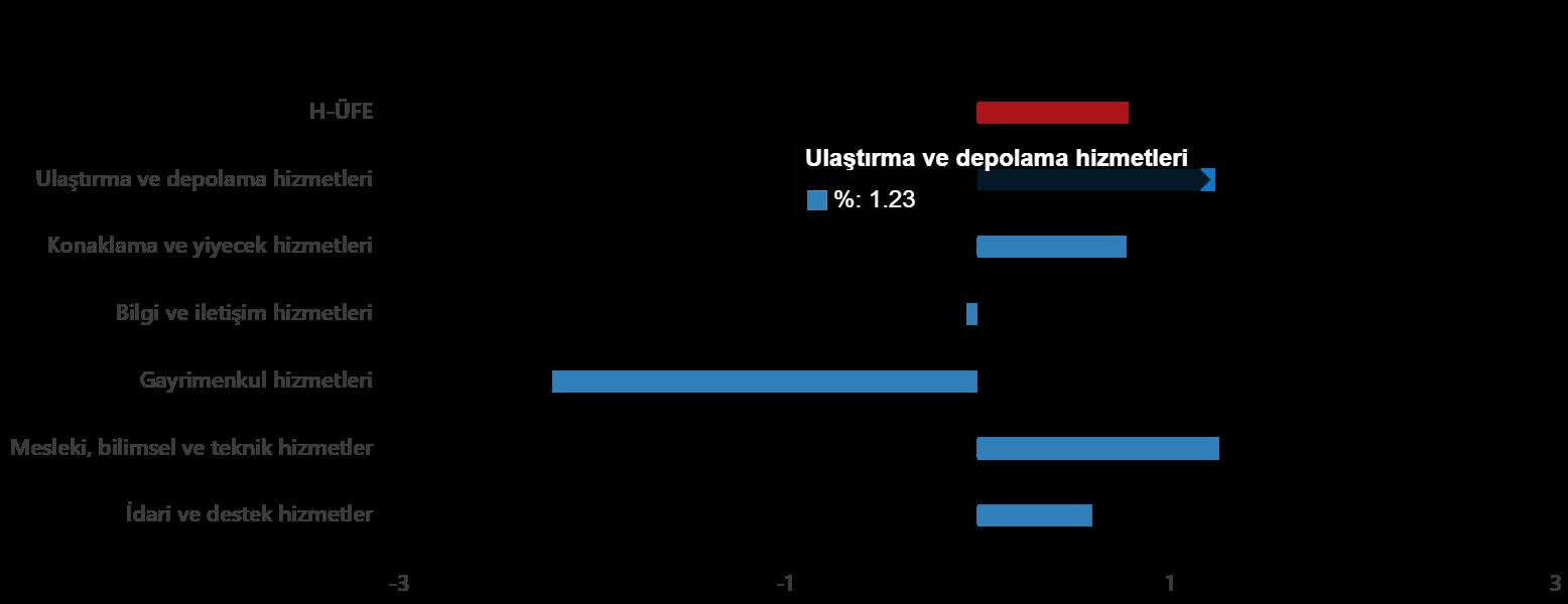 Bir evvelki aya nazaran, ulaştırma ve depolama hizmetlerinde %1,23 artış, konaklama ve yiyecek hizmetlerinde %0,77 artış, bilgi ve bağlantı hizmetlerinde %0,05 azalış, gayrimenkul hizmetlerinde %2,20 azalış, mesleksel, bilimsel ve teknik hizmetlerde %1,25 artış, idari ve takviye hizmetlerde %0,59 artış gerçekleşti.