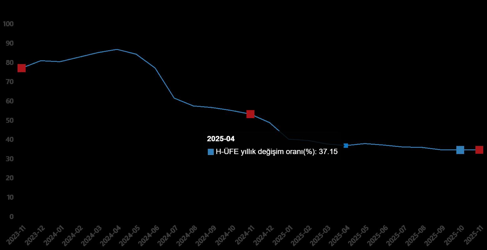 H-ÜFE 2025 yılı Kasım ayında bir evvelki aya nazaran %0,70 azalış, bir evvelki yılın Aralık ayına nazaran %34,07 artış, bir evvelki yılın birebir ayına nazaran %34,93 artış ve on iki aylık ortalamalara nazaran %37,71 artış gösterdi.
