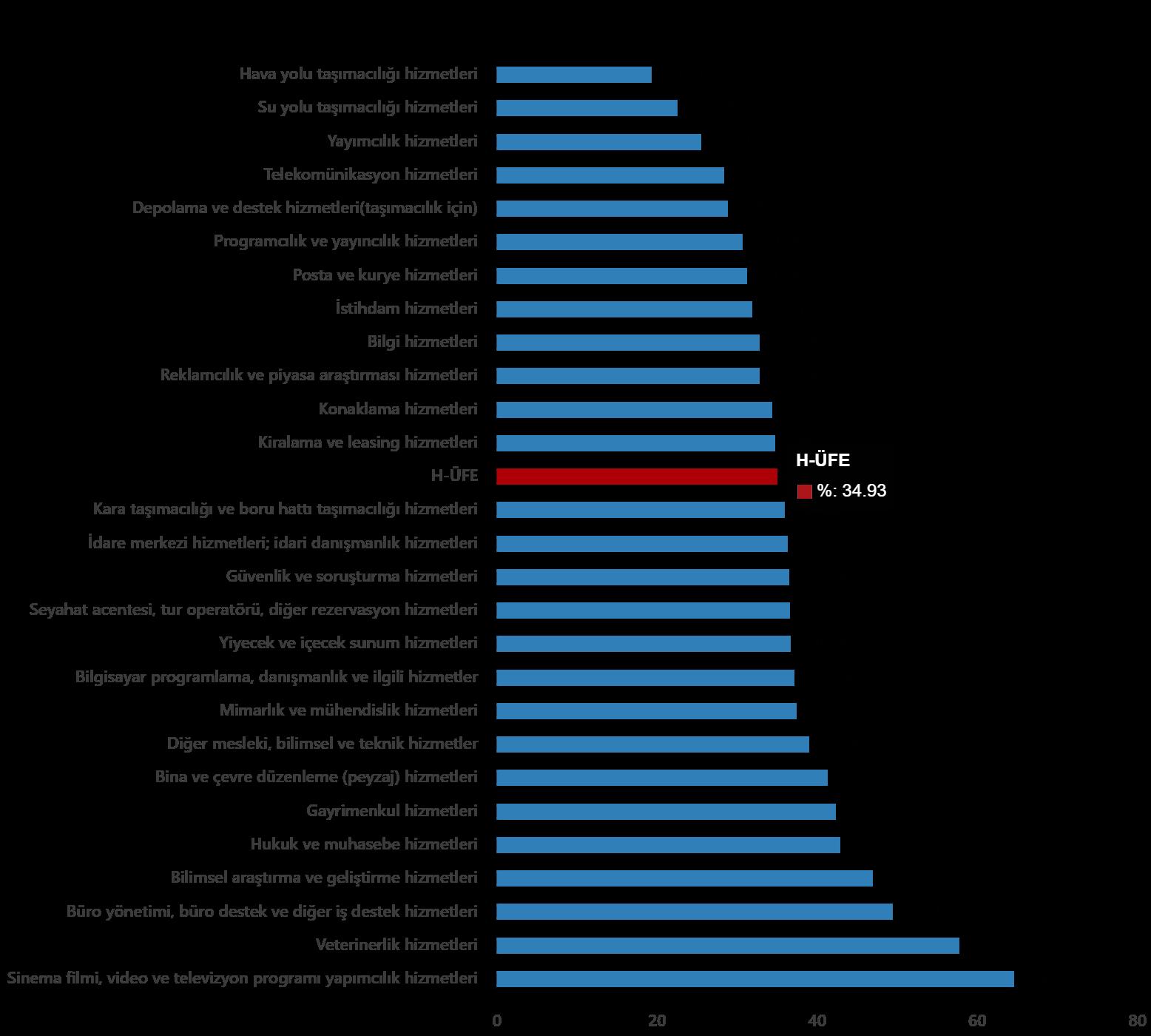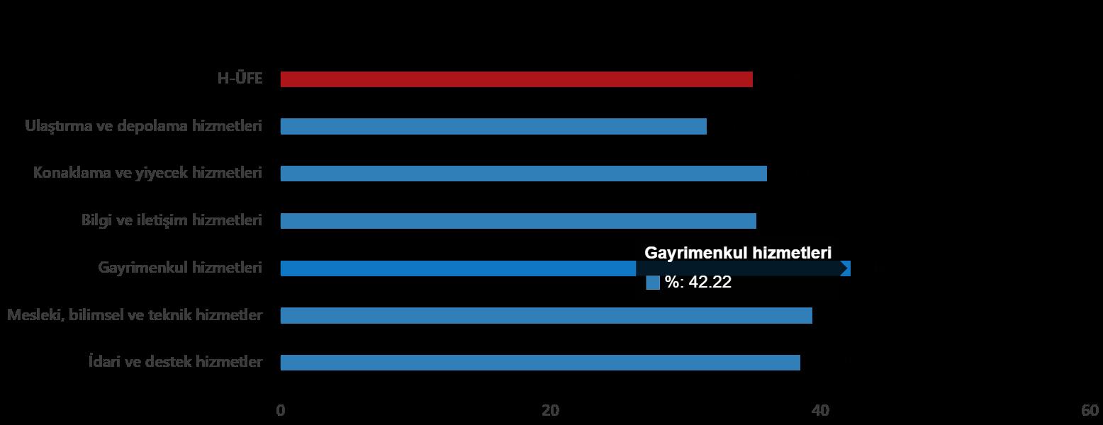 Bir evvelki yılın tıpkı ayına nazaran, ulaştırma ve depolama hizmetlerinde %31,51 artış, konaklama ve yiyecek hizmetlerinde %36,00 artış, bilgi ve bağlantı hizmetlerinde %35,19 artış, gayrimenkul hizmetlerinde %42,22 artış, mesleksel, bilimsel ve teknik hizmetlerde %39,35 artış, idari ve takviye hizmetlerde %38,49 artış gerçekleşti.