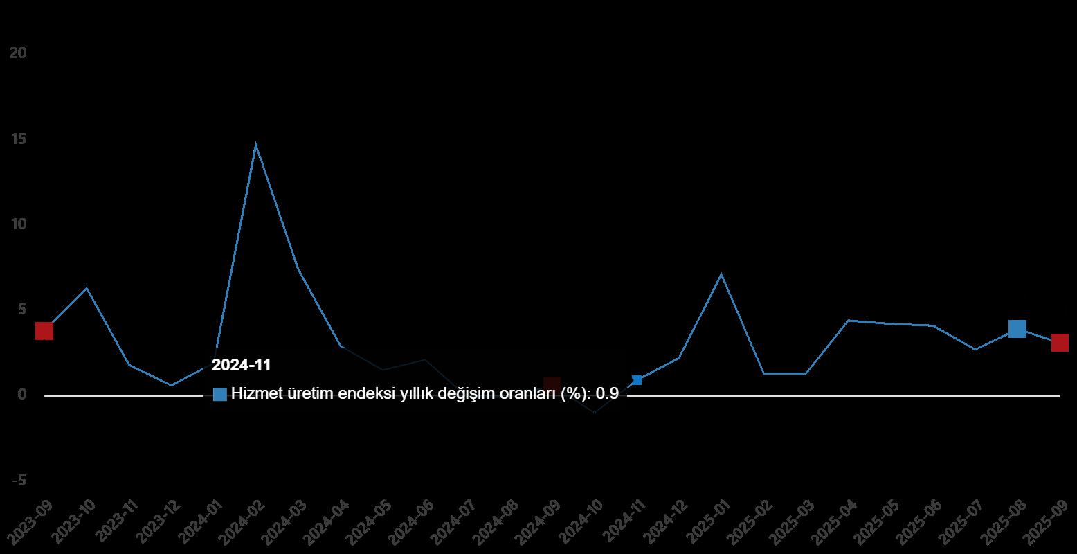 Hizmet üretim endeksi (2021=100) 2025 yılı Eylül ayında bir evvelki aya nazaran %0,1 azaldı. Tıpkı ayda ulaştırma ve depolama hizmetleri %1,2 azaldı, konaklama ve yiyecek hizmetleri birebir kaldı, bilgi ve irtibat hizmetleri %6,3 arttı, gayrimenkul hizmetleri %2,2 azaldı, mesleksel, bilimsel ve teknik hizmetler %3,5 azaldı, idari ve takviye hizmetleri ise %0,1 azaldı.