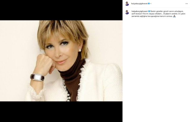 Hülya Koçyiğit de Instagram hesabından yakın arkadaşı Filiz Akın’ın bir karesini paylaşarak, “Benim güzeller güzeli canım arkadaşım, zarif dostum Filiz’im; beyaz orkidem… Dualarım seninle. En yakın zamanda sağlığına kavuşacağına inancım sonsuz. ” dedi.