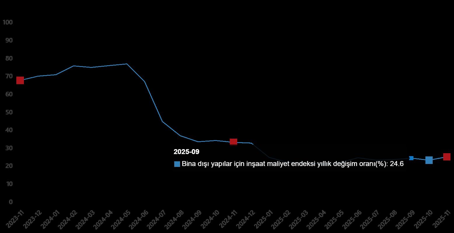 Bina dışı yapılar için inşaat maliyet endeksi yıllık değişim oranı(%), Kasım 2025