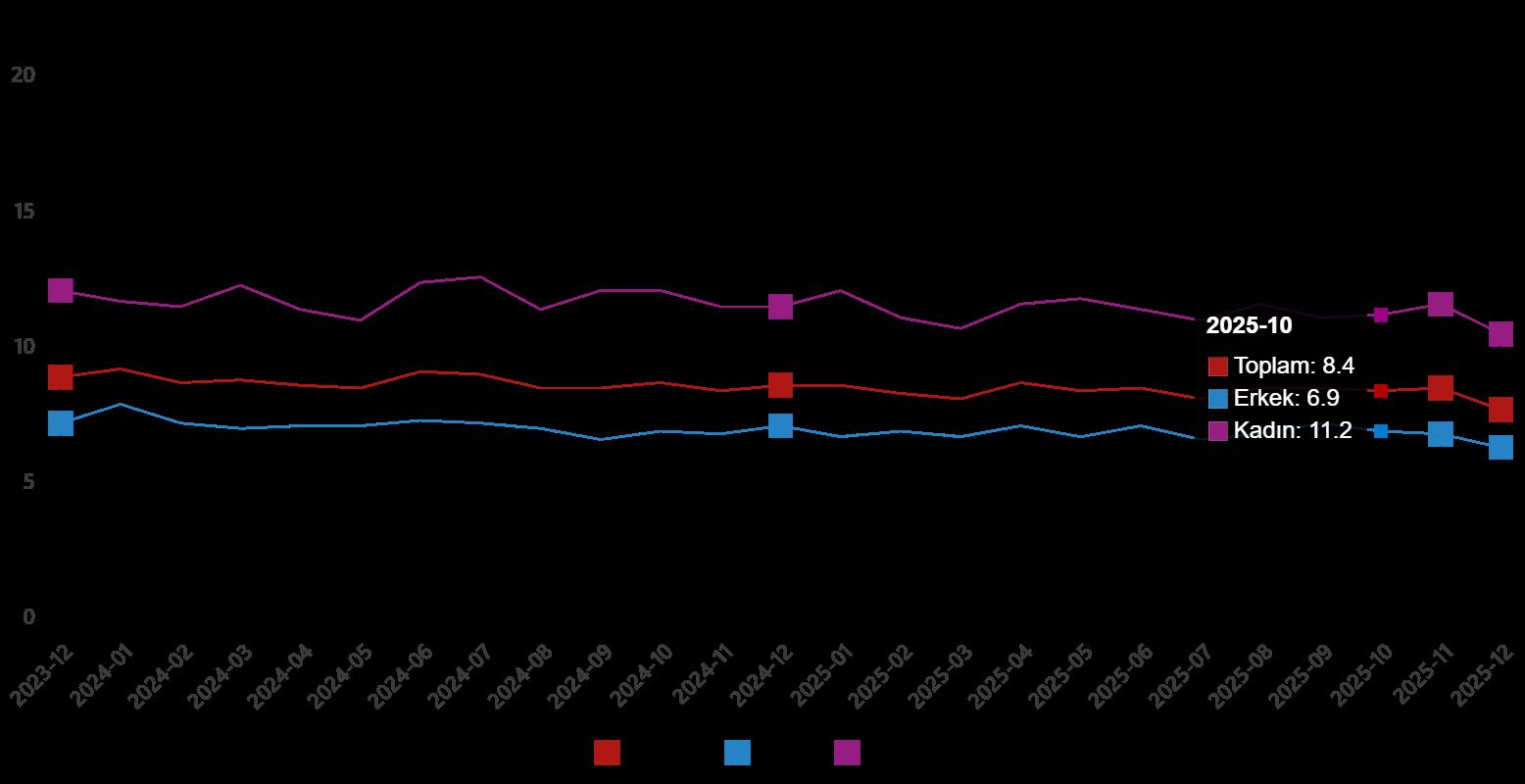 Mevsim tesirinden arındırılmış işsizlik oranı, Aralık 2023 – Aralık 2025