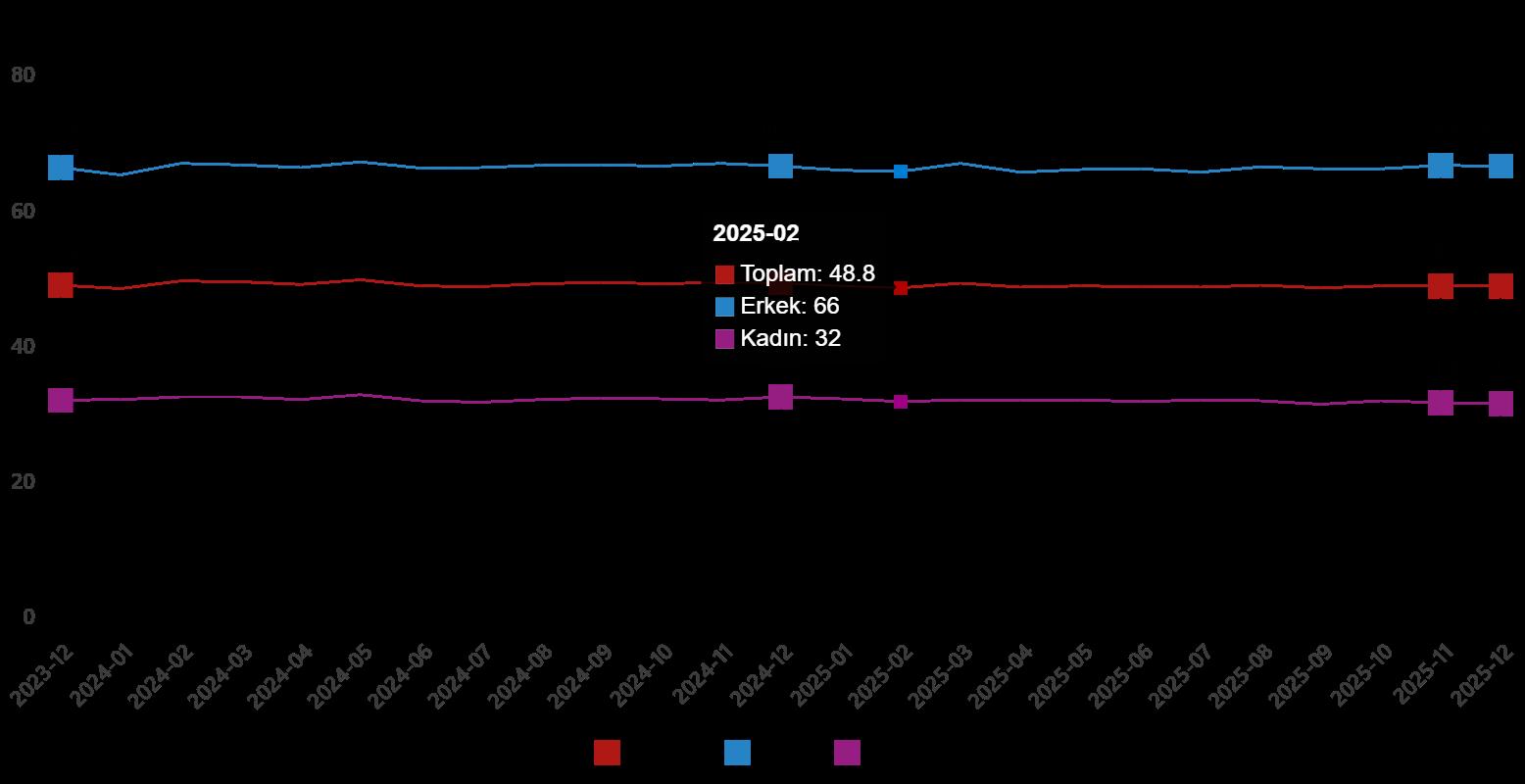 İşgücü, 2025 yılı Aralık ayında bir evvelki aya nazaran 328 bin kişi azalarak 35 milyon 421 bin kişi, işgücüne katılma oranı ise 0,5 puan azalarak %53,2 olarak gerçekleşti. İşgücüne katılma oranı erkeklerde %71,3 iken bayanlarda %35,5 oldu.