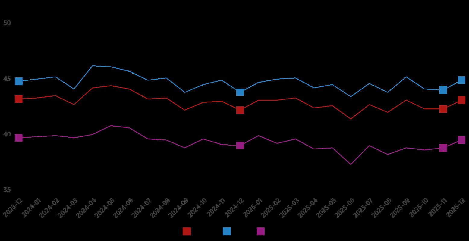 Mevsim ve takvim tesirlerinden arındırılmış haftalık ortalama fiili çalışma mühleti, Aralık 2023 – Aralık 2025