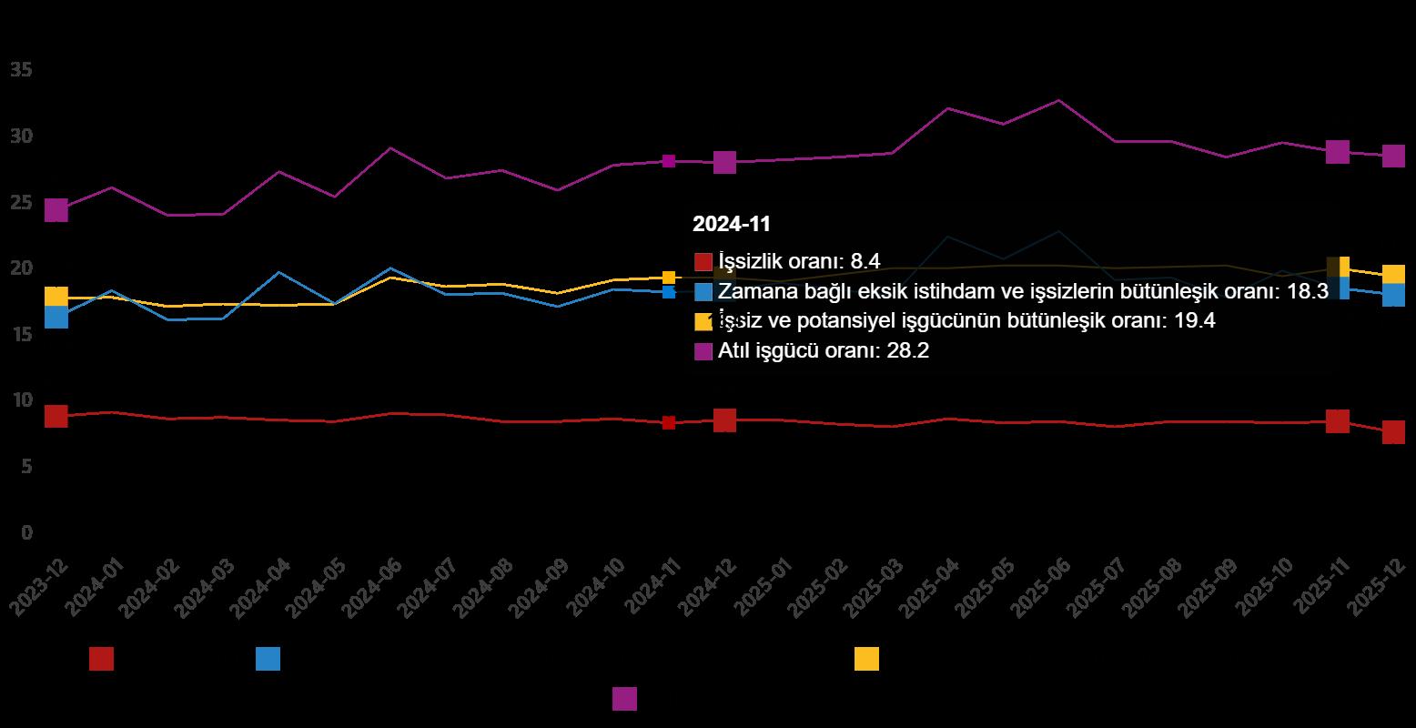Zamana bağlı eksik istihdam, potansiyel işgücü ve işsizlerden oluşan atıl işgücü oranı 2025 yılı Aralık ayında bir evvelki aya nazaran 0,3 puan azalarak %28,6 oldu. Vakte bağlı eksik istihdam ve işsizlerin bütünleşik oranı %18,1 iken işsiz ve potansiyel işgücünün bütünleşik oranı %19,5 olarak kestirim edildi.