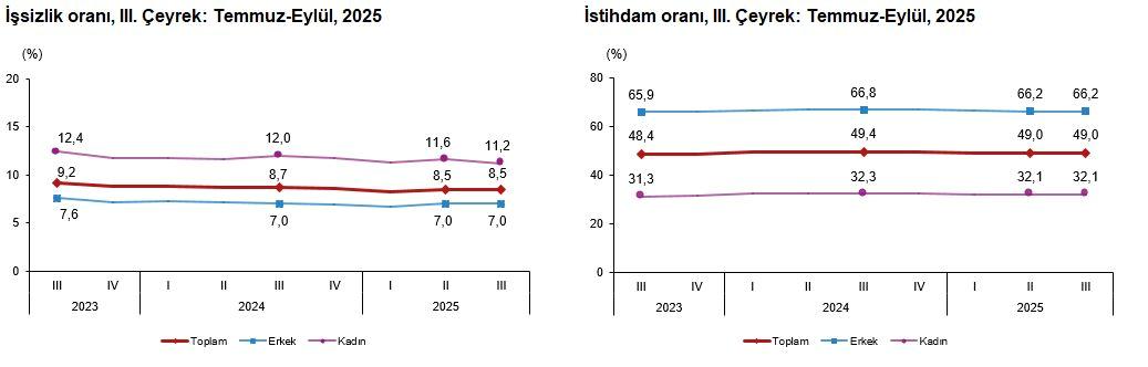 İstihdam edilenlerin sayısı 2025 yılı III. çeyreğinde bir evvelki çeyreğe nazaran 65 bin kişi artarak 32 milyon 558 bin kişi, istihdam oranı ise değişim göstermeyerek %49,0 oldu. Bu oran erkeklerde %66,2 iken bayanlarda %32,1 olarak gerçekleşti.