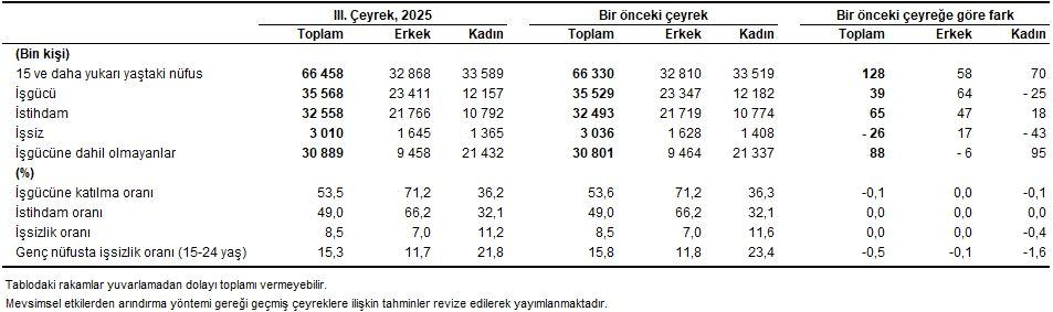İşgücü, 2025 yılı III. çeyreğinde bir evvelki çeyreğe nazaran 39 bin kişi artarak 35 milyon 568 bin kişi, işgücüne katılma oranı ise 0,1 puanlık azalış ile %53,5 olarak gerçekleşti. İşgücüne katılma oranı erkeklerde %71,2, bayanlarda ise %36,2 oldu.
