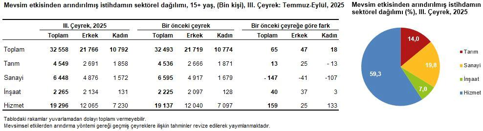 Mevsim tesirinden arındırılmış istihdam edilenlerin sayısı 2025 yılı III. çeyreğinde bir evvelki çeyreğe nazaran tarım dalında 13 bin kişi, inşaat dalında 40 bin kişi, hizmet bölümünde 159 bin kişi artarken, sanayi kesiminde 147 bin kişi azaldı. İstihdam edilenlerin %14,0’ı tarım, %19,8’i sanayi, %7,0’ı inşaat, %59,3’ü ise hizmet bölümünde yer aldı.