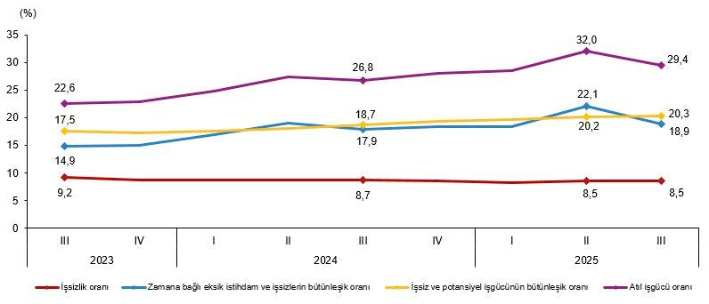 Zamana bağlı eksik istihdam, potansiyel işgücü ve işsizlerden oluşan atıl işgücü oranı 2025 yılı III. çeyreğinde bir evvelki çeyreğe nazaran 2,6 puanlık azalış ile %29,4 oldu. Vakte bağlı eksik istihdam ve işsizlerin bütünleşik oranı %18,9 iken potansiyel işgücü ve işsizlerin bütünleşik oranı %20,3 olarak kestirim edildi.