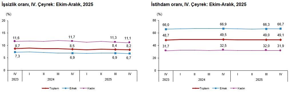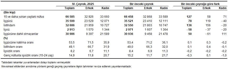 Hanehalkı İşgücü Araştırması sonuçlarına nazaran; 15 ve daha üst yaştaki şahıslarda işsiz sayısı 2025 yılı IV. çeyreğinde bir evvelki çeyreğe nazaran 58 bin kişi azalarak 2 milyon 913 bin kişi oldu. İşsizlik oranı ise 0,2 puanlık azalış ile %8,2 düzeyinde gerçekleşti. İşsizlik oranı erkeklerde %6,7, bayanlarda %11,1 olarak iddia edildi.