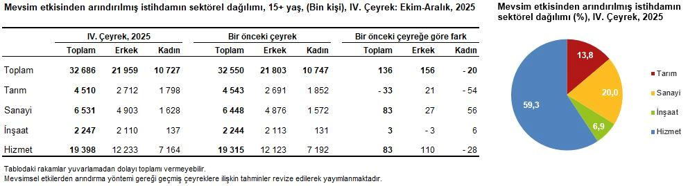 Mevsim tesirinden arındırılmış istihdam edilenlerin sayısı 2025 yılı IV. çeyreğinde bir evvelki çeyreğe nazaran tarım bölümünde 33 bin kişi azalırken, sanayi dalında 83 bin kişi, inşaat kesiminde 3 bin kişi, hizmet kesiminde 83 bin kişi arttı. İstihdam edilenlerin %13,8’i tarım, %20,0’ı sanayi, %6,9’u inşaat, %59,3’ü ise hizmet bölümünde yer aldı.