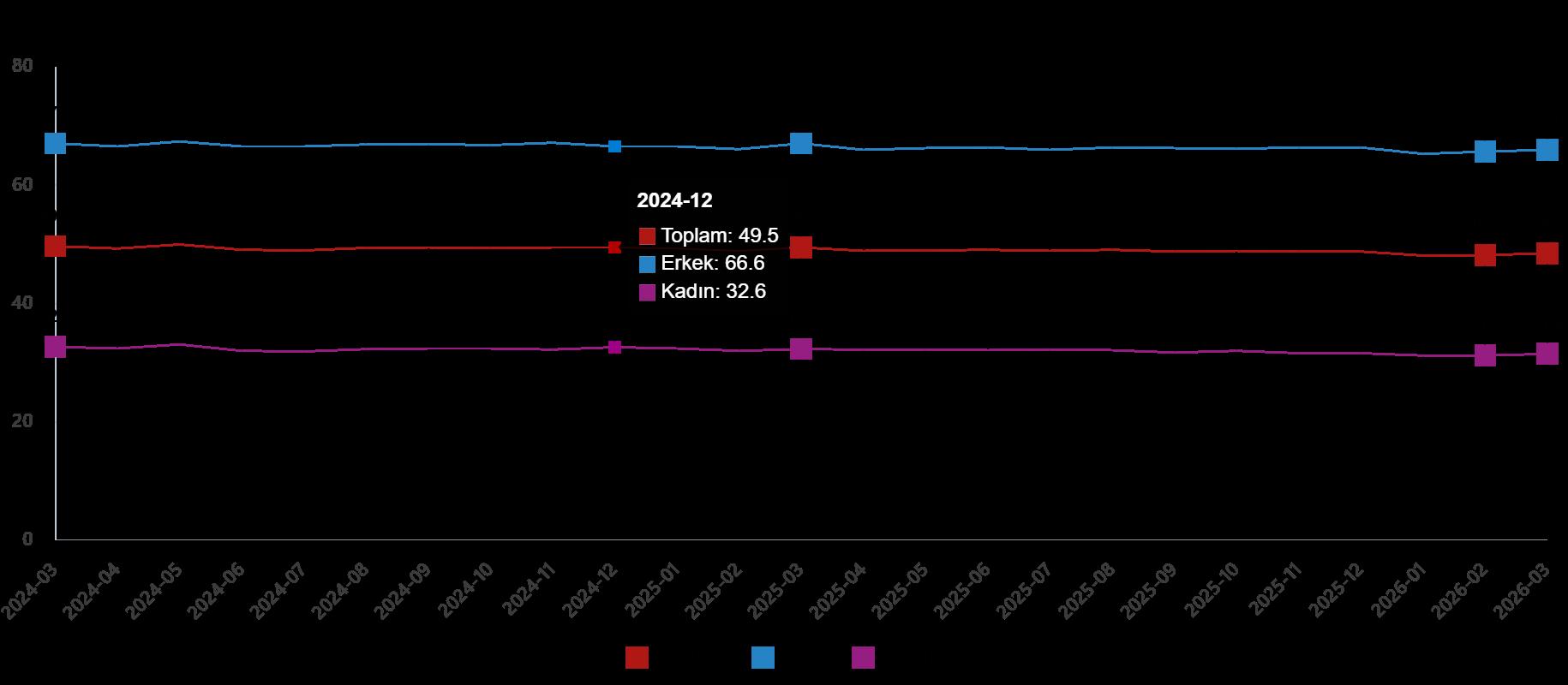 İşgücü, 2026 yılı Mart ayında bir evvelki aya nazaran 129 bin kişi artarak 35 milyon 298 bin kişi, işgücüne katılma oranı ise 0,1 puan artarak %52,8 olarak gerçekleşti. İşgücüne katılma oranı erkeklerde %70,8 iken bayanlarda %35,3 oldu.