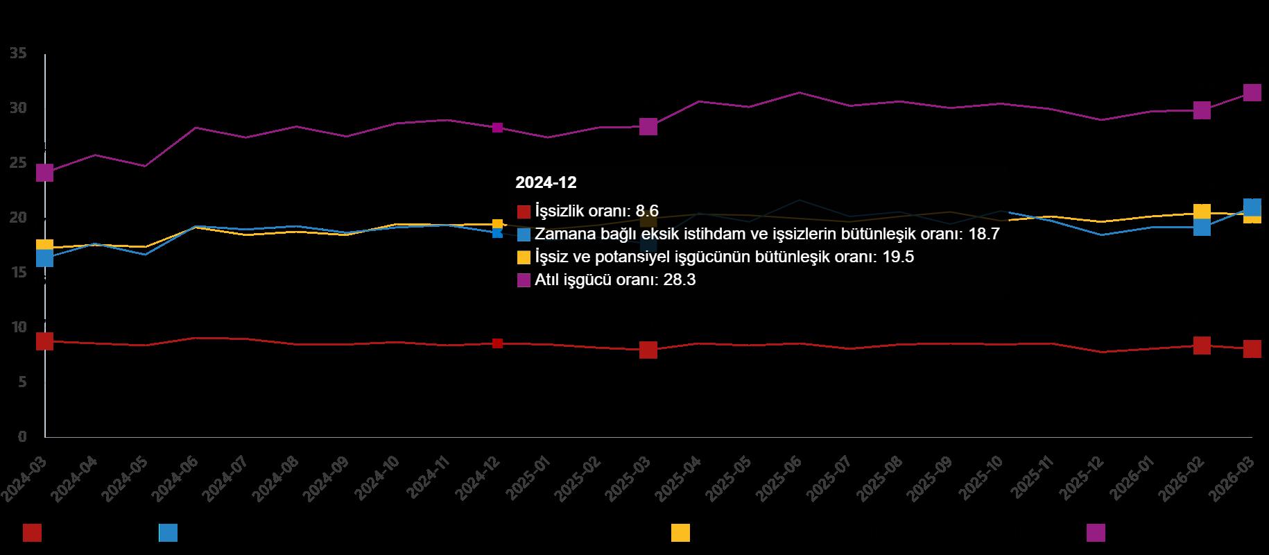 Zamana bağlı eksik istihdam, potansiyel işgücü ve işsizlerden oluşan atıl işgücü oranı 2026 yılı Mart ayında bir evvelki aya nazaran 1,6 puan artarak %31,5 oldu. Vakte bağlı eksik istihdam ve işsizlerin bütünleşik oranı %21,0 iken işsiz ve potansiyel işgücünün bütünleşik oranı %20,4 olarak iddia edildi.