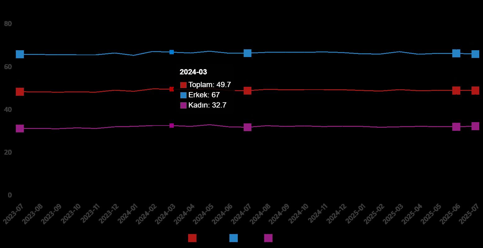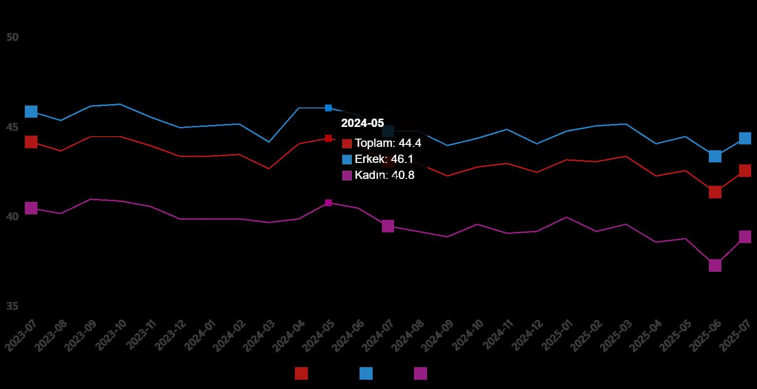 İşgücü, 2025 yılı Temmuz ayında bir evvelki aya nazaran 146 bin kişi azalarak 35 milyon 410 bin kişi, işgücüne katılma oranı ise 0,3 puan azalarak %53,3 olarak gerçekleşti. İşgücüne katılma oranı erkeklerde %70,6 iken bayanlarda %36,4 oldu.