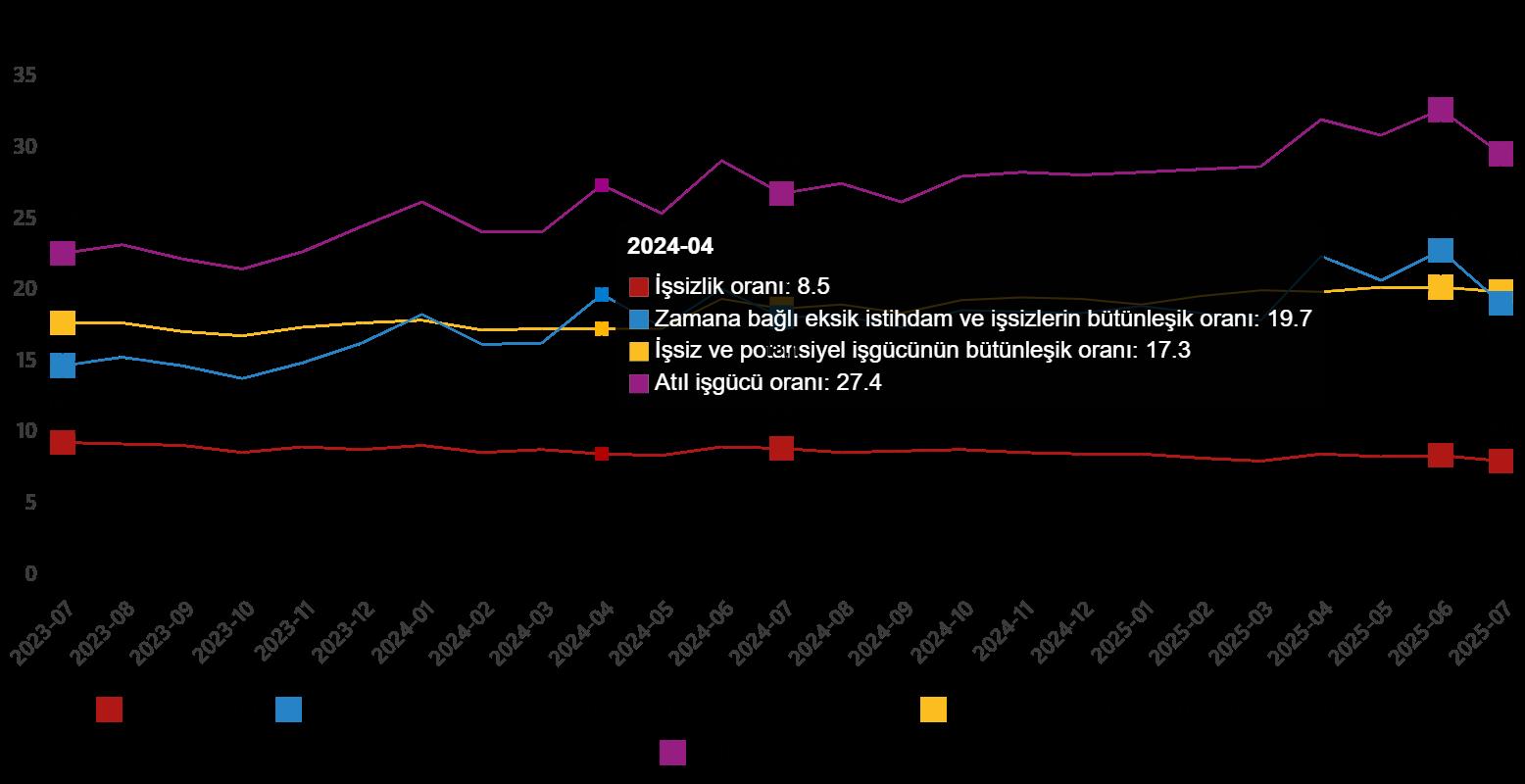 Zamana bağlı eksik istihdam, potansiyel işgücü ve işsizlerden oluşan atıl işgücü oranı 2025 yılı Temmuz ayında bir evvelki aya nazaran 3,1 puan azalarak %29,6 oldu. Vakte bağlı eksik istihdam ve işsizlerin bütünleşik oranı %19,1 iken işsiz ve potansiyel işgücünün bütünleşik oranı %19,9 olarak iddia edildi.