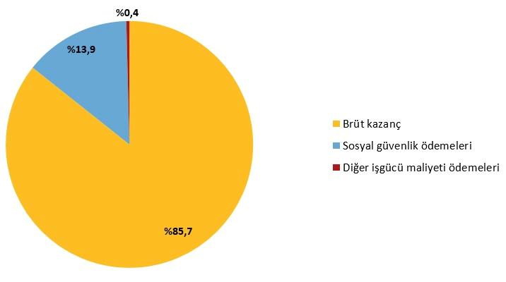 İşgücü maliyeti içinde brüt yararın hissesi %85,7, toplumsal güvenlik ödemelerinin hissesi %13,9 ve başka işgücü maliyeti ödemelerinin hissesi %0,4 olarak gerçekleşti.