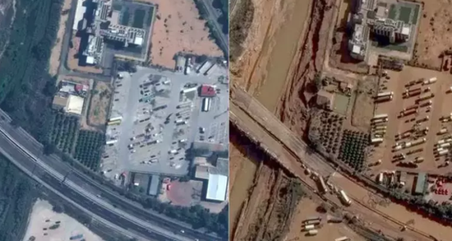 Uydudan alınan görüntü, sel felaketinden önce 8 Ekim’de ve sel felaketinden sonra 30 Ekim’de Valensiya çevresindeki manzarayı gösteriyor.
