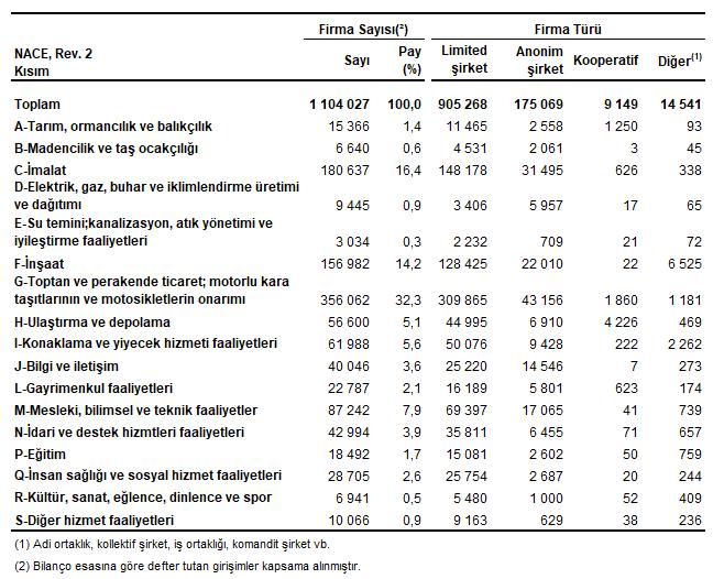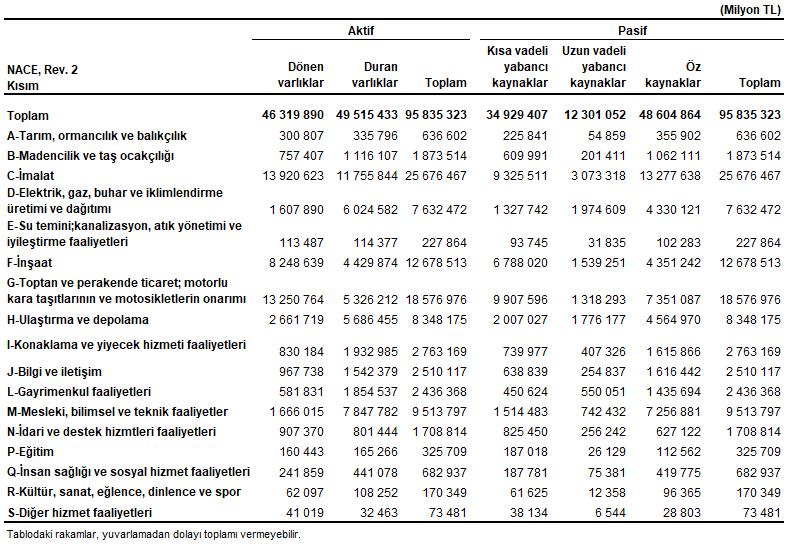 İmalat kesimi 25 trilyon 676 milyar 467 milyon TL faal büyüklüğü ile tüm kesimler ortasında birinci sırada geldi. Etkin büyüklüğünde ikinci sırayı 18 trilyon 576 milyar 976 milyon TL ile toptan ve perakende ticaret; motorlu kara taşıtlarının ve motosikletlerin tamiri bölümü aldı. Öz kaynaklar bakımından imalat kesimi 13 trilyon 277 milyar 638 milyon TL ile birinci sırada yer alırken, onu sırasıyla 7 trilyon 351 milyar 87 milyon TL ile toptan ve perakende ticaret; motorlu kara taşıtlarının ve motosikletlerin tamiratı bölümü, 7 trilyon 256 milyar 881 milyon TL ile de mesleksel, bilimsel ve teknik faaliyetler bölümü takip etti.