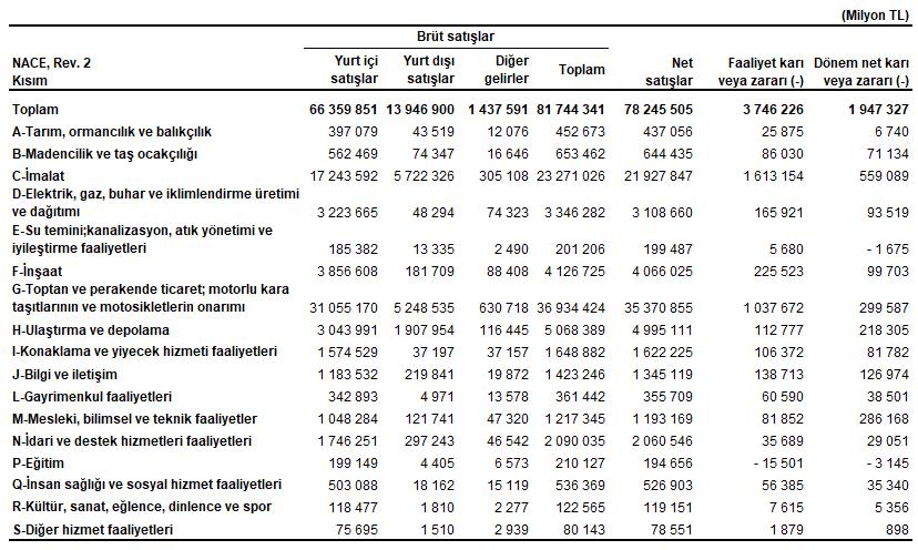 Firmaların toplulaştırılmış gelir tablosu verisine nazaran, 2024 yılında tüm bölümlerin toplulaştırılmış devir net karı 1 trilyon 947 milyar 327 milyon TL olarak gerçekleşti. İmalat dalı 559 milyar 89 milyon TL ile en yüksek net kar elde eden dal oldu. Toptan ve perakende ticaret; motorlu kara taşıtlarının ve motosikletlerin tamiratı kesimi 299 milyar 587 milyon TL, mesleksel, bilimsel ve teknik faaliyetler dalı ise 286 milyar 168 milyon TL net kar elde etti. Eğitim kesimi 2024 yılını 3 milyar 145 milyon TL, su temini; kanalizasyon, atık idaresi ve uygunlaştırma faaliyetleri bölümü ise 1 milyar 675 milyon TL net ziyan ile tamamladı.