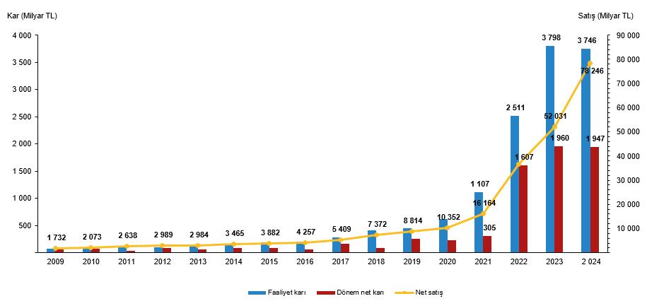 Sektör Bilançoları kapsamında bulunan tüm firmaların 2024 yılı toplam net satışları 78 trilyon 245 milyar 505 milyon TL, toplam faaliyet karı ise 3 trilyon 746 milyar 226 milyon TL olarak gerçekleşti.