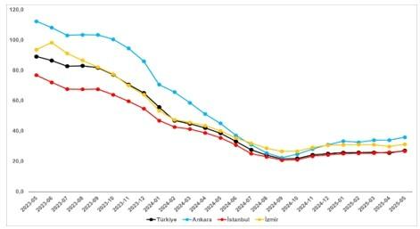 Rapora nazaran, Mayıs 2025 prestijiyle satılık konutların yıllık gerçek fiyat değişimi ülke genelinde yüzde -6,2, İstanbul’da yüzde -6,4, İzmir’de ise yüzde -3,1 düzeylerinde gerçekleşti. Ankara’da ise yıllık gerçek fiyat değişimi yüzde 0,4 ile müspet bölgeye geçti. Satılık konutların cari fiyatlarının yıllık artış oranı ise Nisan 2025’e kıyasla 1,5 puan artarak ülke genelinde yüzde 27,1 oldu.