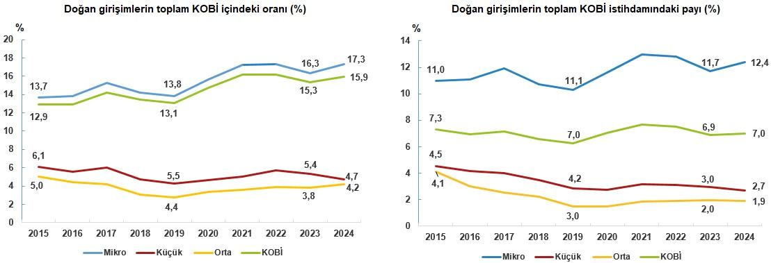 2023 yılında doğan KOBİ teşebbüs sayısının, 2023 yılındaki etkin KOBİ teşebbüs sayısına oranı (girişim doğum oranı) %15,3 ve 2023 yılında doğan KOBİ teşebbüslerindeki istihdamın, 2023 yılındaki etkin KOBİ’lerin toplam istihdamı içindeki hissesi %6,9 iken, 2024 yılında bu oranlar teşebbüs doğum oranında %15,9 ve istihdam hissesinde ise %7,0 olarak gerçekleşmiştir.