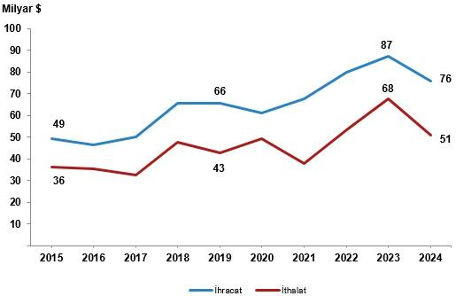 KOBİ’lerin 2015 yılında 49 milyar dolar olan ihracat bedeli 2024 yılında 76 milyar dolara yükseldi. İthalatta ise 2015 yılında 36 milyar dolar olan paha, 2024 yılında 51 milyar dolara yükseldi.