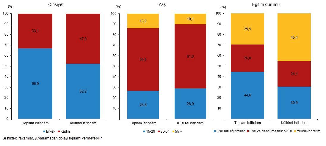 Kültürel istihdamın %79,9’unu kültürel meslek alanlarında, %20,1’ini ise kültürel olmayan meslek alanlarında çalışanlar oluşturdu. Kültürel istihdamda olanların %32,6’sını el sanatları çalışanları, %19,2’sini mimarlar, planlamacılar, harita mühendisleri ve dizayncılar, %8,2’sini ise muharrirler, gazeteciler ve dilbilimciler oluşturdu. Bayan istihdam oranının en az olduğu kültürel meslek alanı %28,2 ile sanat, kültür ve mutfak ile ilgili yardımcı profesyonel meslek mensupları olurken, bayan istihdam oranının en yüksek olduğu kültürel meslek alanı %77,7 ile öbür lisan öğretmenleri oldu.