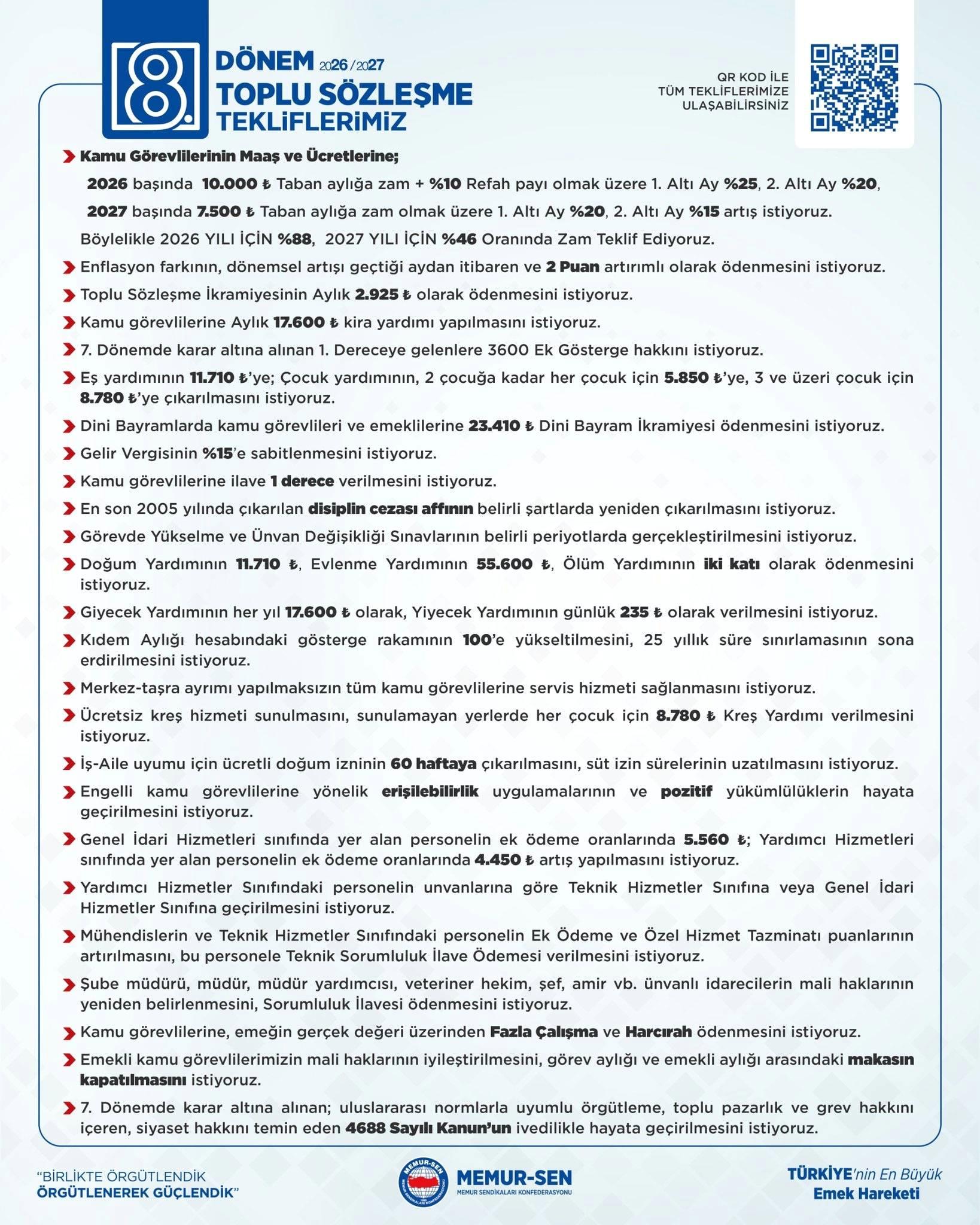İşte o teklif, “8. Dönem Toplu Sözleşme Tekliflerimiz Yetkili konfederasyon olarak, kamu görevlileri ile emeklilerinin 2026-2027 yıllarını kapsayacak maaş ve ücret artışlarıyla, diğer mali ve sosyal haklarının görüşüleceği 8. Dönem Toplu Sözleşme Tekliflerimiz:  2026 için 6’şar aylık dönemler itibariyle; {10.000 TL (Taban Aylığı)+ %10 (Refah Payı) + %25} + {%20] Olmak üzere toplamda %88 artış teklif ediyoruz.  2027 için 6’şar aylık dönemler itibariyle; {7.500 TL(Taban Aylığı) + %20 + {%15] Olmak üzere toplamda %46 artış teklif ediyoruz. 4 milyona yakın kamu görevlisi, 2 milyondan fazla kamu görevlisi emeklisini kapsayan 8. Dönem Toplu Sözleşme tekliflerimizin milletimize ve kamu görevlilerine hayırlı olmasını diliyoruz” (BSHA – Bilim ve Sağlık Haber Ajansı)